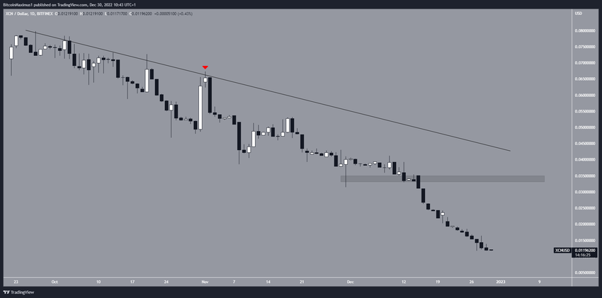 Cena XCN spadła poniżej opadającej linii oporu od 27 września. Linia ta spowodowała odrzucenie 1 listopada (czerwona ikona) prowadząc do przyspieszenia ruchu spadkowego. Doprowadziło to do nowego all-time low na poziomie 0,011 USD w dniu 30 grudnia.