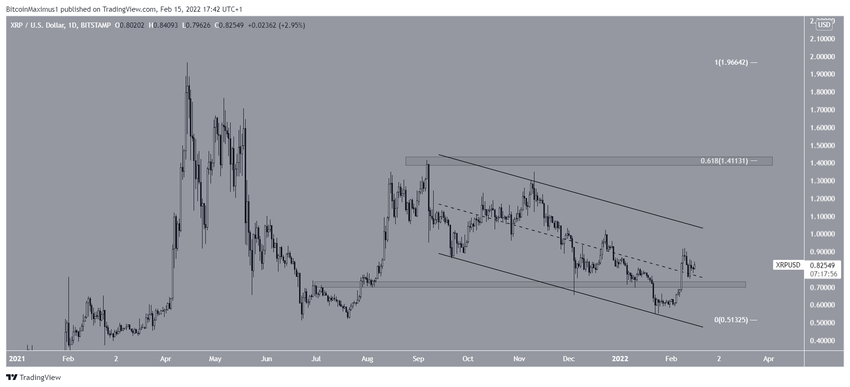 Na wykresie dziennym widać, że XRP konsoliduje wewnątrz kanału równoległego zniżkującego od września. Takie kanały zawierają zazwyczaj ruchy korekcyjne. W związku z tym, ewentualne wybicie z niego byłoby najbardziej prawdopodobnym scenariuszem.