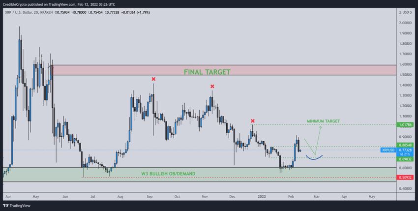 Jeśli XRP poruszałby się powyżej tego poziomu, byłoby to silnym potwierdzeniem, że długoterminowy trend jest byczy. W takim wypadku cena ostatecznie będzie zmierzać w kierunku nowego ATH.