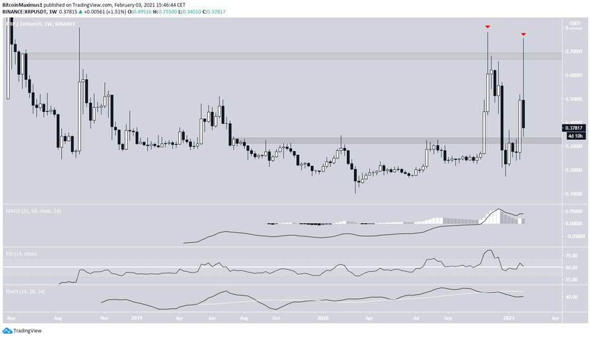 Wykres tygodniowy pokazuje, że XRP zostało dwukrotnie odrzucone przez długoterminowy obszar oporu na 0,68 USD – ostatnio 1 lutego. Za każdym razem utworzyło długie górne knoty.