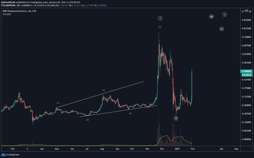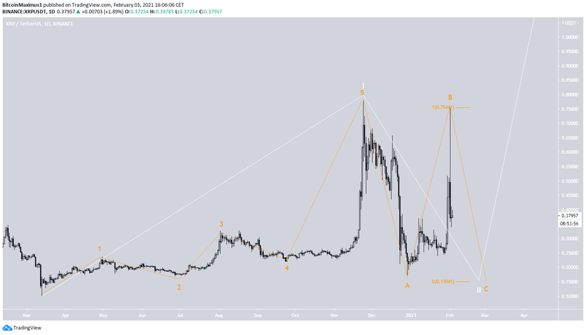 Chociaż długoterminowa liczba (biały) jest nadal zwyżkowa, możliwe, że XRP ma strukturę korygującą A-B-C (pomarańczowy). Wydaje się, że obecnie znajduje się w fali C.
