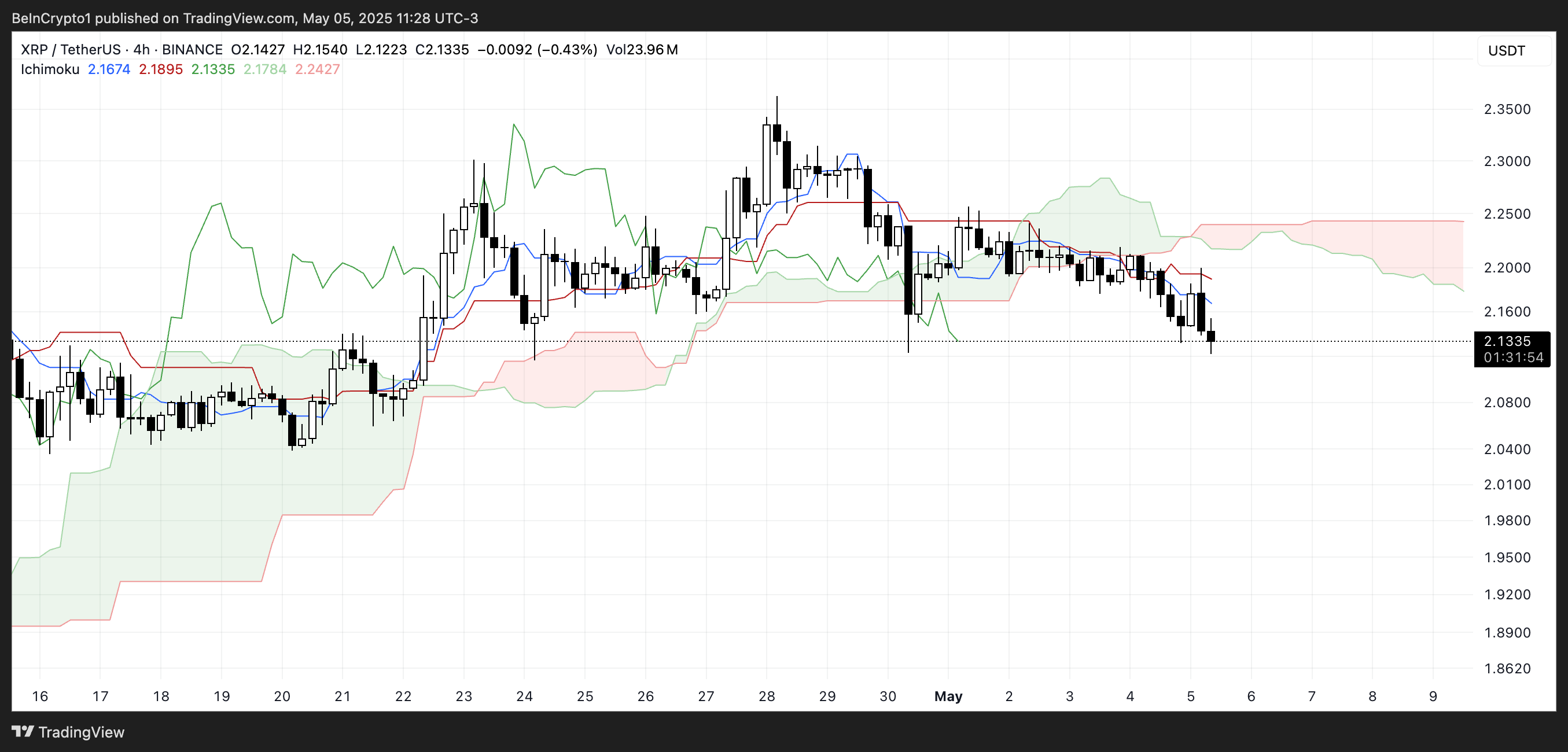 Kumo (chmura), reprezentująca przyszłe wsparcie i opór, zmieniła kolor na czerwony i jest skierowana w dół – jest to kolejny niedźwiedzi sygnał. Cena znacznie poniżej chmury potwierdza, że XRP znajduje się w pełni niedźwiedziej fazie według analizy Ichimoku.