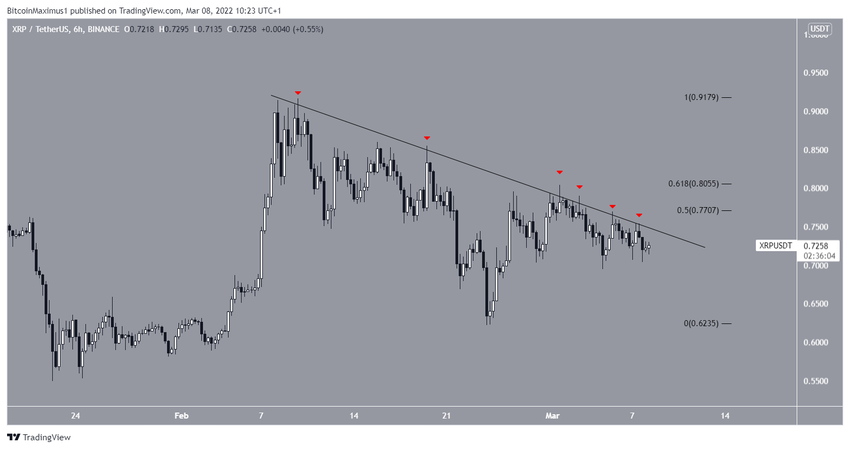 Od 8 lutego XRP spada poniżej opadającej linii oporu. XRP potwierdziło już 6-krotnie tę linię (czerwone ikony), ostatnio w dniu 7 marca.