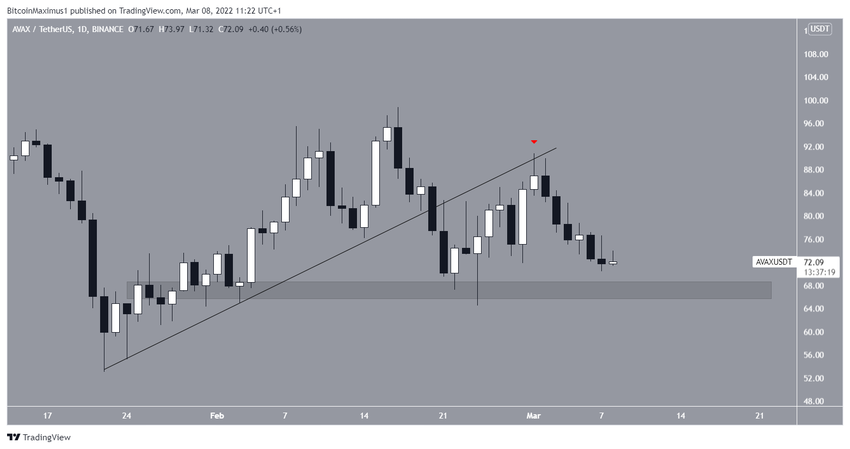 AVAX wzrastał powyżej wznoszącej się linii wsparcia od dnia 22 stycznia. Jednak załamał się z niej 20 lutego i zatwierdził jako opór 1 marca (czerwona ikona). Od tego czasu cena porusza się w dół.