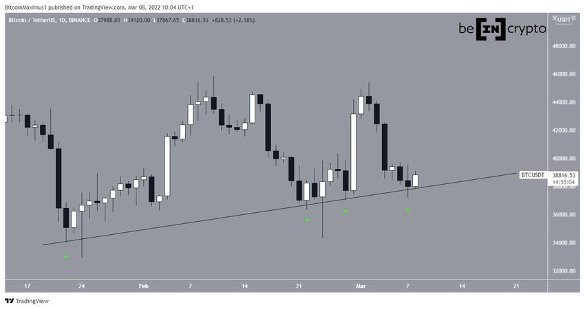 BTC wzrasta powyżej wznoszącej się linii wsparcia od dnia 24 stycznia. Do tej pory linia ta została potwierdzona cztery razy (zielone ikony), ostatnio 7 marca. Ponadto, BTC dwukrotnie na krótko załamał się poniżej tej linii wsparcia, po czym szybko ją odzyskał.