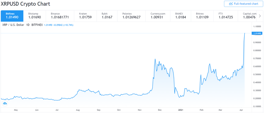 W momencie pisania tego tekstu XRP przebił poziom 1 USD, a moneta zajęła czwarte miejsce na TradingView. Token wzrósł o ponad 45% w ciągu ostatnich 24 godzin.