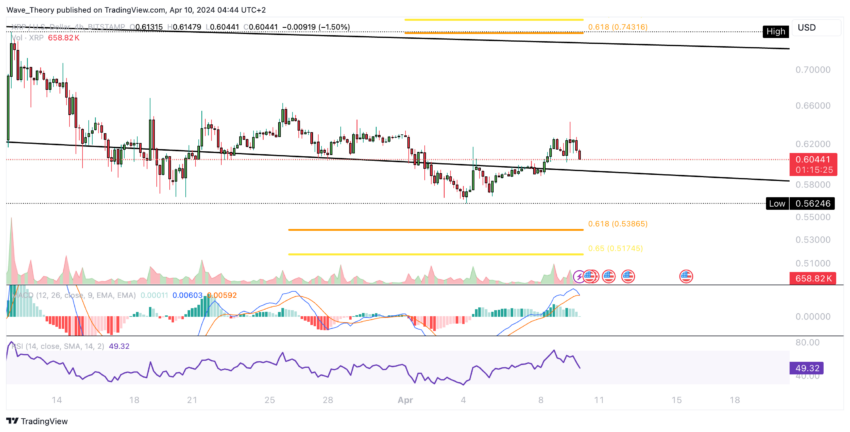 Niedawny spadek nastąpił po tym, jak Ripple doświadczył niedźwiedziego odrzucenia na poziomie oporu zniesienia 0,382 Fibonacciego, czyli w okolicach 0,632 USD. W związku z tym Ripple może teraz powrócić do wsparcia przy złotej proporcji w okolicach 0,52 USD.