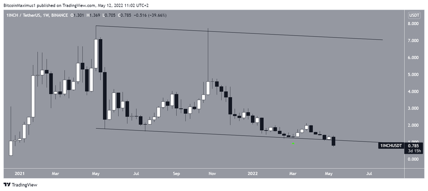 1inch Network (1INCH) od maja 2021 roku spada wewnątrz zniżkującego kanału równoległego. Chociaż w marcu kurs odbił się od linii wsparcia (zielona ikona), nie udało mu się zainicjować znaczącego ruchu w górę.