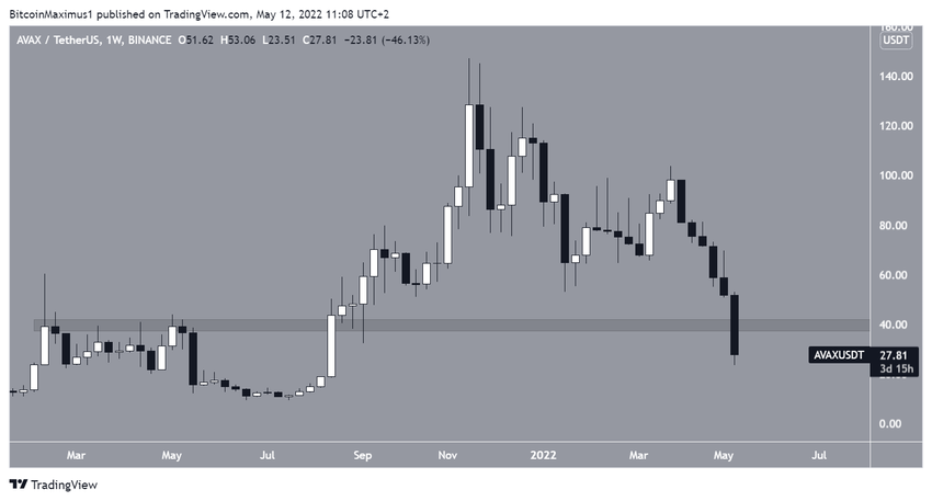 Avalanche (AVAX) spada od czasu osiągnięcia ATH w listopadzie 2021 roku na poziomie 147 USD. Następnie ruch spadkowy przyspieszył na początku kwietnia, a cena osiągnęła dołek na poziomie 23,51 USD w dniu 12 maja.