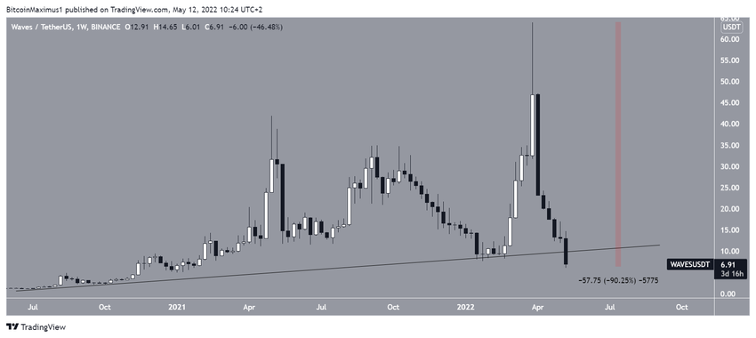 Ponadto obecnie WAVES jest w trakcie załamywania się ze wznoszącej linii wsparcia, która obowiązywała od lipca 2021 roku.