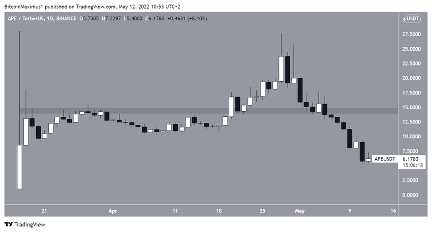 ApeCoin (APE) spada od czasu osiągnięcia w dniu 28 kwietnia szczytu na poziomie 27,60 USD. Ruch w dół był szybki, a 5 maja cena załamała się z horyzontalnego wsparcia na poziomie 14 USD.