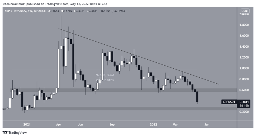XRP spada wzdłuż opadającej linii oporu od kwietnia 2021 roku. Linia ta była testowana wiele razy, ostatnio w marcu (czerwona ikona).
