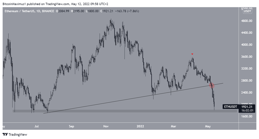 Do tej pory ETH osiągnął dołek na poziomie 1800 USD, co nastąpiło w dniu 12 maja. Spadek nastąpił bardzo blisko horyzontalnego obszaru wsparcia na poziomie 2700 USD, który wcześniej obowiązywał od czerwca 2021 roku.