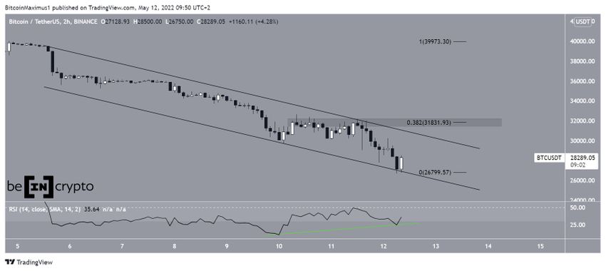 Bitcoin (BTC) spada wewnątrz opadającego kanału równoległego od dnia 5 maja. Ten ruch w dół doprowadził jak dotąd do dołka na poziomie 26 700 USD w dniu 12 maja. Dołek ten posłużył do potwierdzenia linii wsparcia równoległego kanału zniżkującego. Dodatkowo, towarzyszyła mu bycza dywergencja na wskaźniku RSI.