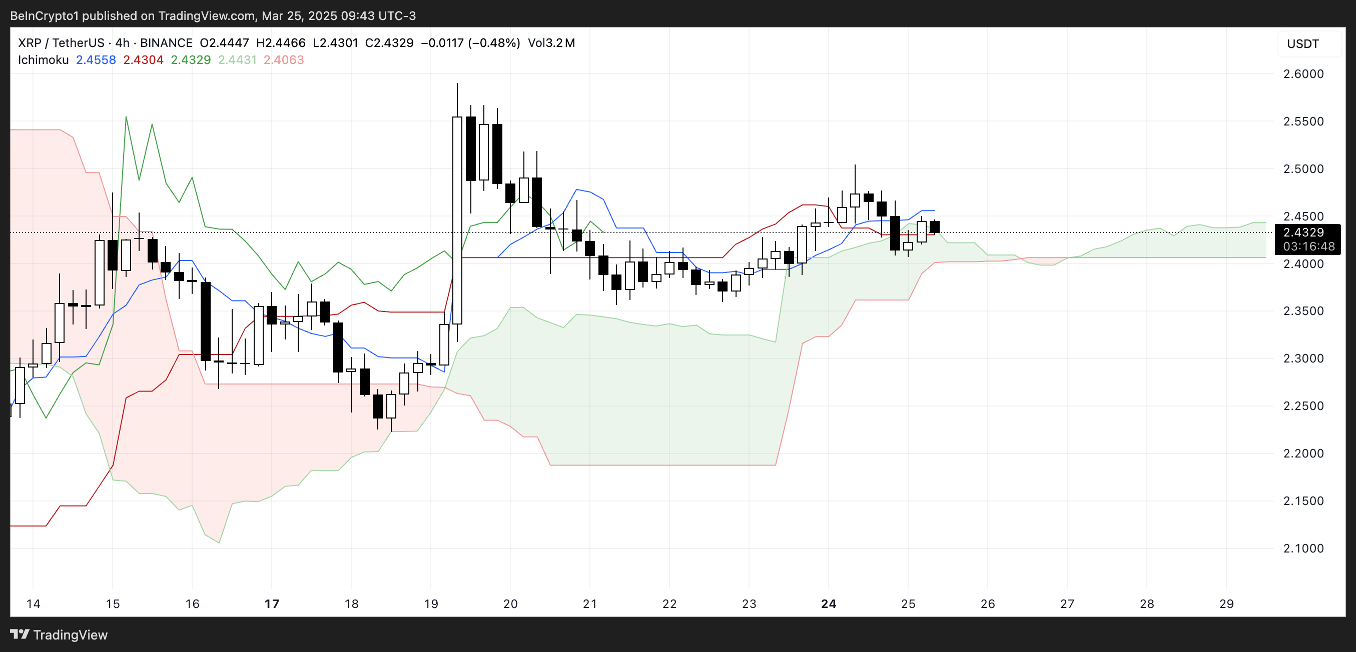 Wykres chmury Ichimoku dla XRP pokazuje rynek w konsolidacji, z ceną unoszącą się tuż nad chmurą. Jednak wyraźnie XRP spowalnia impet.