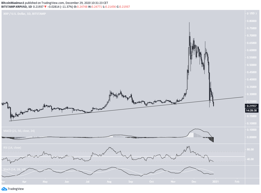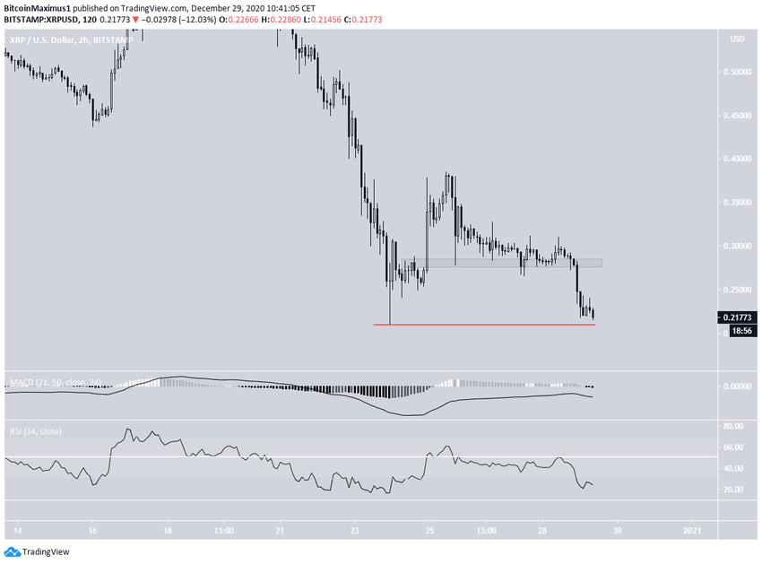XRP jest obecnie notowany tuż powyżej wsparcia na poziomie 0,21 USD. Jeśli ten obszar wsparcia się załamie, to następny będzie wynosił 0,175 USD.