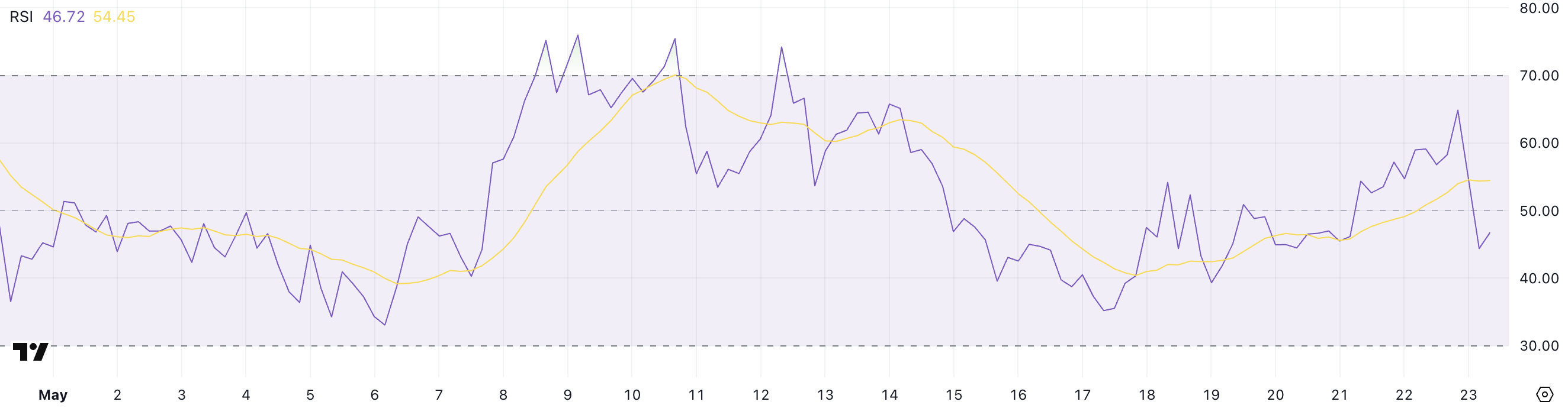 Przy poziomie 46,72, XRP powrócił do strefy neutralnej, sygnalizując niezdecydowanie i potencjalną przerwę w poprzednim ruchu wzrostowym.