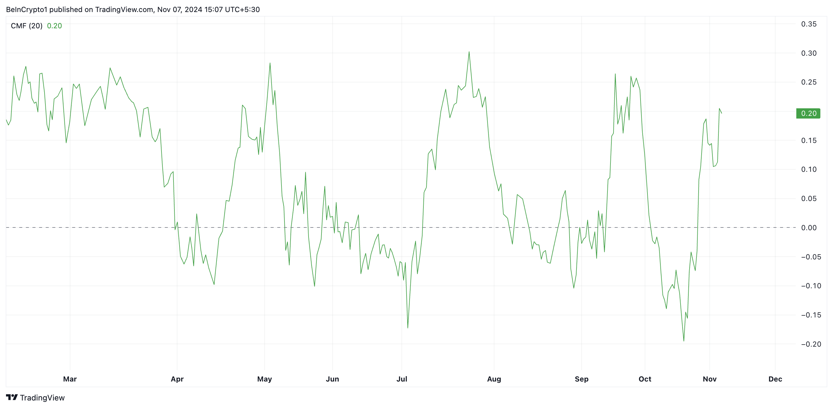 Rzeczywiste zapotrzebowanie uczestników rynku wspiera wzrost XRP o 5% w ciągu ostatnich 24 godzin. Sprawiło to, że XRP ustanawia solidne wsparcie. Ponadto, ten wzrost odzwierciedla pozytywna wartość wskaźnika przepływów pieniężnych Chaikina (CMF) dla tokena, który mierzy przepływy pieniędzy do i z aktywa. Obecnie CMF dla XRP ma tendencję wzrostową i wynosi 0,20.