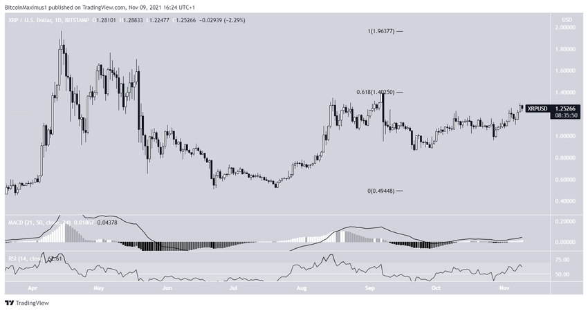Podobnie jak w przypadku tygodniowego interwału, RSI i MACD poruszają się w górę na dziennym interwale, wspierając możliwość, że XRP się wybije.