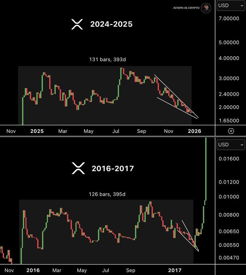 Jednocześnie Steph Is Crypto wskazuje na 393 dni konsolidacji cenowej. Warto dodać, że taki sam okres poprzedzał dynamiczne wybicie XRP w 2017 roku. Analityk w swoim poście napisał: