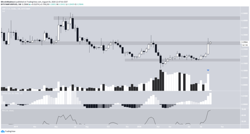 Tygodniowy wykres dla XRP pokazuje, że cena znajduje się w kluczowym obszarze oporu na poziomie 0,295 USD. Nie osiągnęła ona tygodniowego zamknięcia powyżej tego poziomu od sierpnia 2019 r., nie biorąc pod uwagę wysokich knotów, które go przekroczyły.
