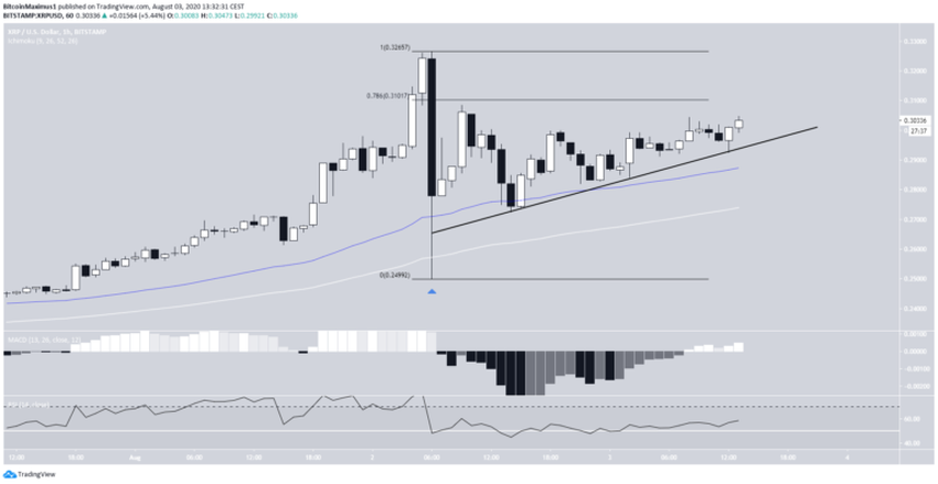 Cena XRP gwałtownie rosła od momentu wybicia z linii oporu w dniu 8 lipca, a następnie potwierdzenia jej dnia 20 lipca. Możemy również zauważyć niewielki opór i wsparcie odpowiednio na poziomach 0,345 i 0,230 USD, z których ten ostatni wcześniej działał jako opór.