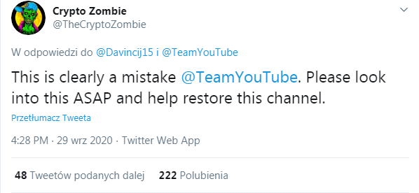 W dniu 29 września znany krypto-influencer Davinci Jeremie, znany w społeczności jako @Davincij15, napisał na Twitterze, że YouTube permanentnie usunął jego kanał. Jednocześnie zwrócił się z prośbą do swoich followersów, aby lajkować i udostępniać jego tweet w nadziei na cofnięcie tej decyzji: