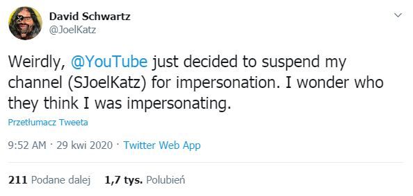 Minął tydzień od ogłoszenia pozwu, a David Schwartz, dyrektor ds. technologii, został zawieszony. A dokładniej jego kanał na YouTube. Powód? Rzekome podszywanie się pod innych. Schwartz napisał, że zawieszono mu konto na platformie: