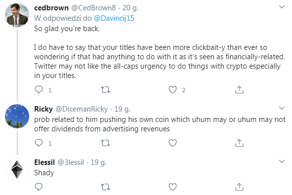 Pod tweetem pojawiło się też sporo komentarzy z prośbą o wyjaśnienie przyczyn zbanowania kanału: