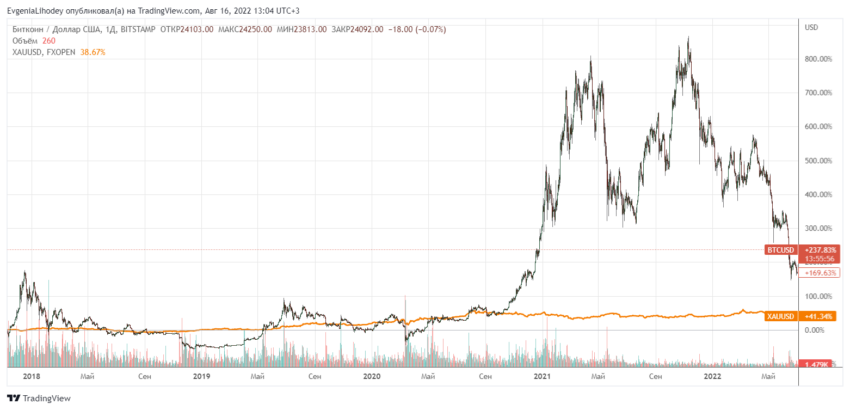 Sponsored SponsoredZłoto wykazuje najmniejszą korelację z Bitcoinem. Na przykład w okresie aktywnego wzrostu BTC w 2021 roku metal szlachetny znajdował się w trendzie bocznym, w którym okresowo wykazywał negatywny trend. Z kolei w 2022 roku złoto było na plusie, gdy kryptowaluta spadała.