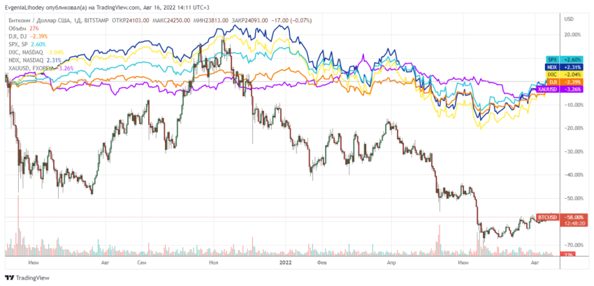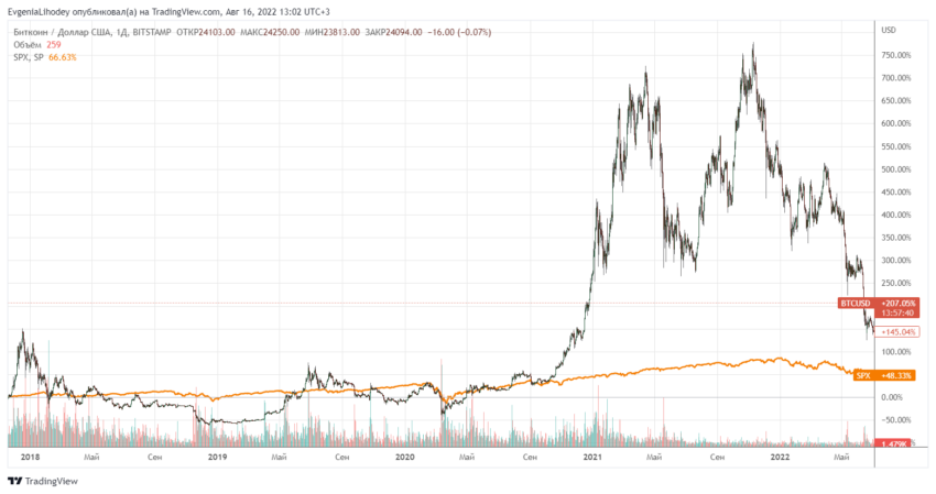 BTC osiągnął szczyt w listopadzie 2021 r. Indeks osiągnął szczyt pod koniec roku. W 2022 roku Bitcoin w dużej mierze kontynuował ruch za S&P 500.