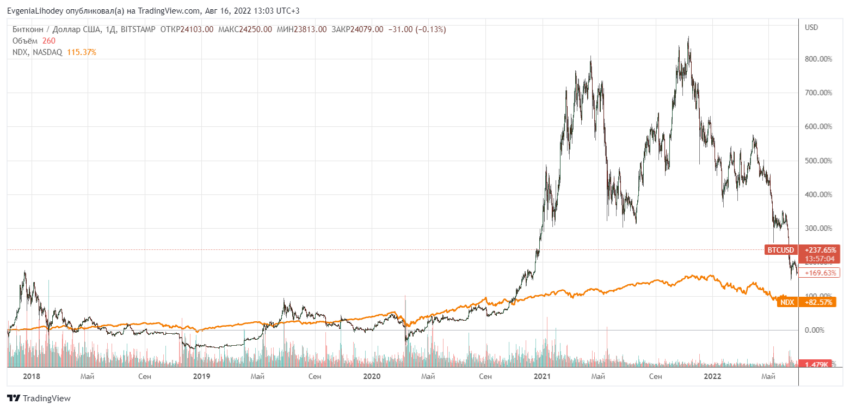 NASDAQ-100 jest niemal dokładnie taki sam jak NASDAQ Composite. Jednak indeks, w przeciwieństwie do Bitcoina, osiągnął szczyt na początku 2022 roku – w okresie, w którym BTC już znacznie spadł ze swojego cyklicznego maksimum.
