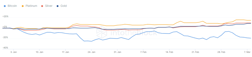 SponsoredRównocześnie w tym samym okresie spadła korelacja Bitcoina z metalami szlachetnymi: złotem, srebrem i platyną. Zmniejszyła się o odpowiedni -0,52, -0,39 i -0,52 do złota, srebra i platyny. Według IntoTheBlock, korelacja jest najniższa od sierpnia 2021 roku.