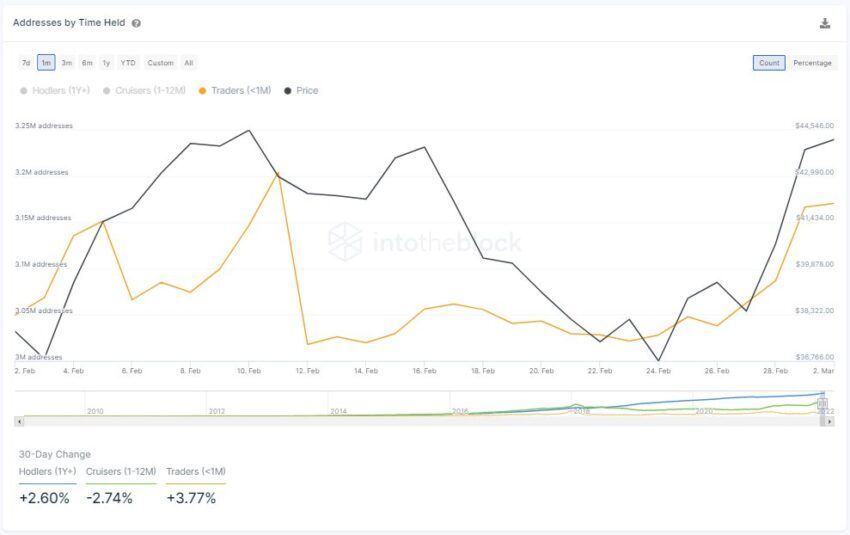 Według danych IntoTheBlock detaliczne zainteresowanie Bitcoinem wydaje się rosnąć. Rośnie liczba posiadaczy BTC, którzy trzymają je krócej niż miesiąc, a także posiadaczy długoterminowych.