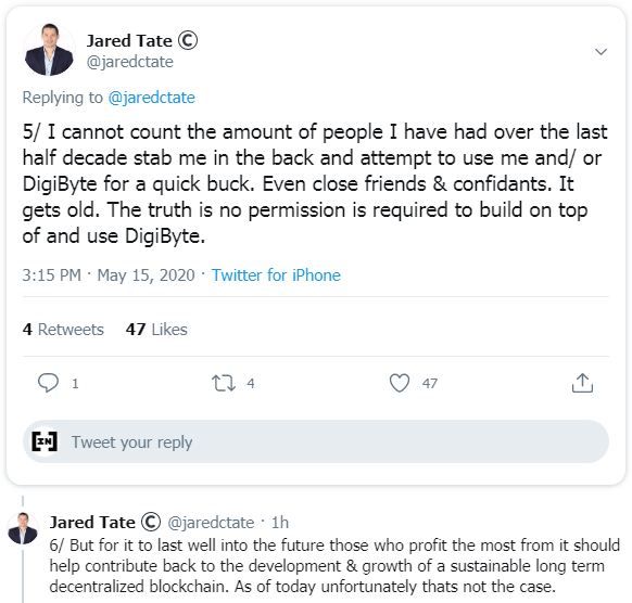 Dodał on, że 90% ludzi w przestrzeni krypto chce się tylko szybko wzbogacić i spieniężyć zyski. Tak samo rzekomo było z DGB. Nikt nie chciał rozwijać projektu open source w celu budowania zdecentralizowanej przestrzeni. Tate napisał również: