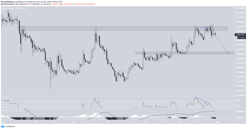 Para ZEC/BTC przedstawia znacznie bardziej niedźwiedzią perspektywę w porównaniu z jej odpowiednikiem w USD. Cena została odrzucona przez obszar oporu na 0,00675 satoshi, tworząc kilka długich górnych knotów oraz formację podwójnego szczytu.