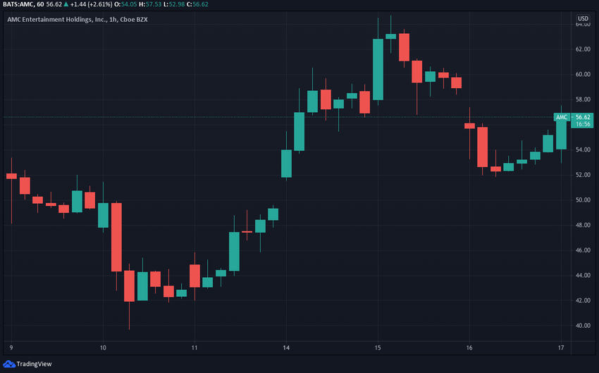 Jednak w tym momencie powróciła presja sprzedażowa i kurs spadł do 52 USD. Obecnie AMC notowane jest w okolicach 56 USD.