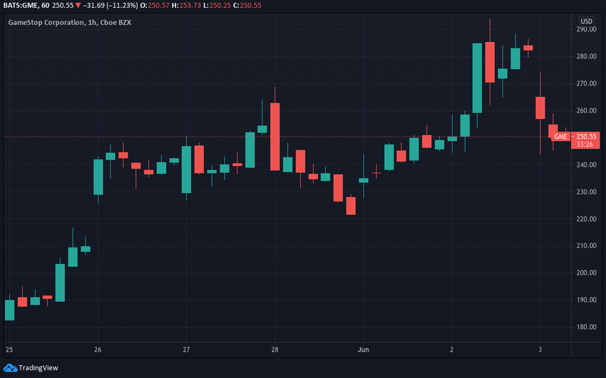 Tymczasem GameStop (GME) wydaje się ponownie przyciągać zainteresowanie. Po tygodniowym zakresie między 160 a 180 USD, GME przekroczył granicę 200 USD w dniu 25 maja, a następnie 26 maja wzrósł jeszcze bardziej do 240 USD.