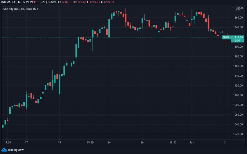 Kanadyjska firma e-commerce Shopify ma za sobą kilka dobrych tygodni. Od 13 maja cena ich akcji stale rośnie osiągając poziom nieco poniżej 1040 USD. Do 17 maja cena wzrosła do 1100 USD, a do 19 maja do 1140 USD.