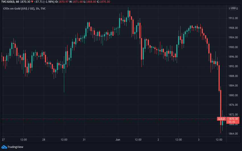 Wartość ta została utrzymana w dniu 31 maja, a nawet nieznacznie przekroczona do 1915 USD w dniu 1 czerwca. Jednak od tego momentu cena złota spadła poniżej 1900 USD pomiędzy 2 a 3 czerwca. Obecnie kosztuje około 1870 USD.