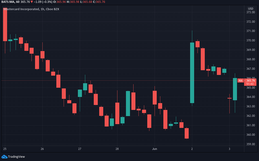 Przez następne dwa dni notowań MA z trudem przekroczył 365 USD, ostatecznie spadając poniżej 360 USD pod koniec 1 czerwca. Jednak cena wzrosła i skoczyła dalej do 370 USD w godzinie otwarcia 2 czerwca, ale potem spadła w ciągu dnia. Obecnie kosztuje około 365 USD.