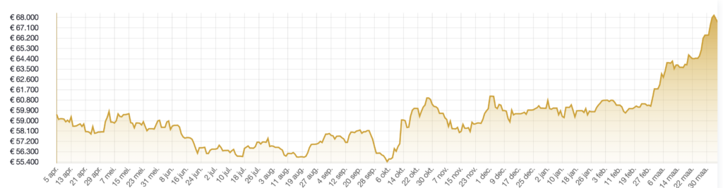 Wzrost cen złota rozpoczął się w październiku. Wówczas cena wzrosła z 55 tys. euro za kilogram do ponad 63 tys. euro pod koniec marca. Październikowy dołek na poniższym wykresie zbiega się z początkiem wojny w Izraelu.