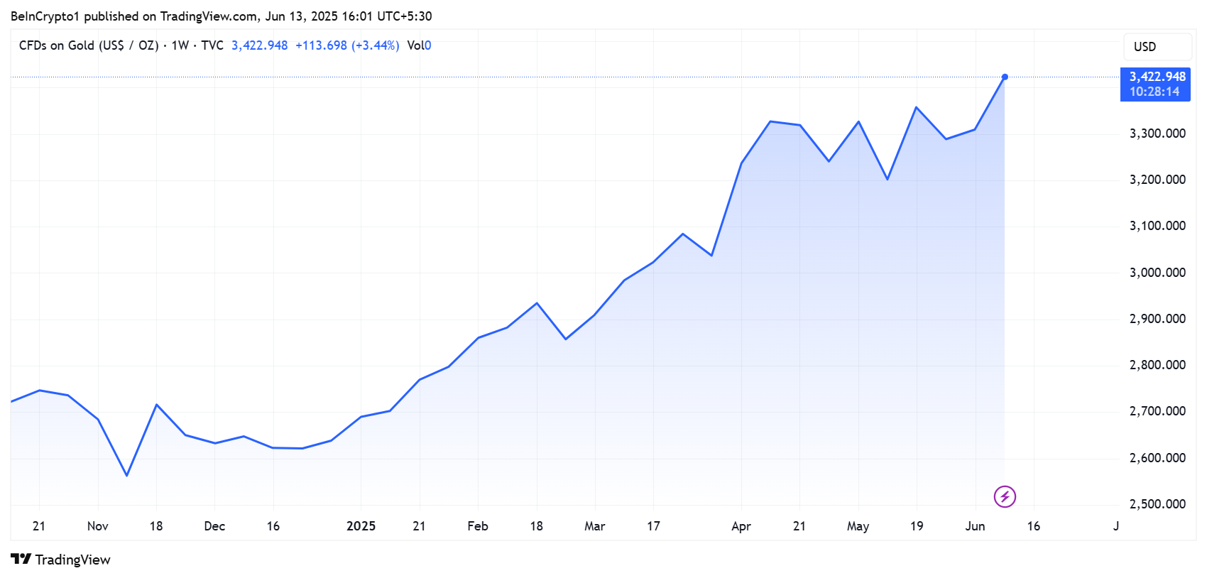 Cena złota wzrosła, podczas gdy Bitcoin spada gwałtownie, gdy narastające napięcia geopolityczne wstrząsnęły globalnymi rynkami.