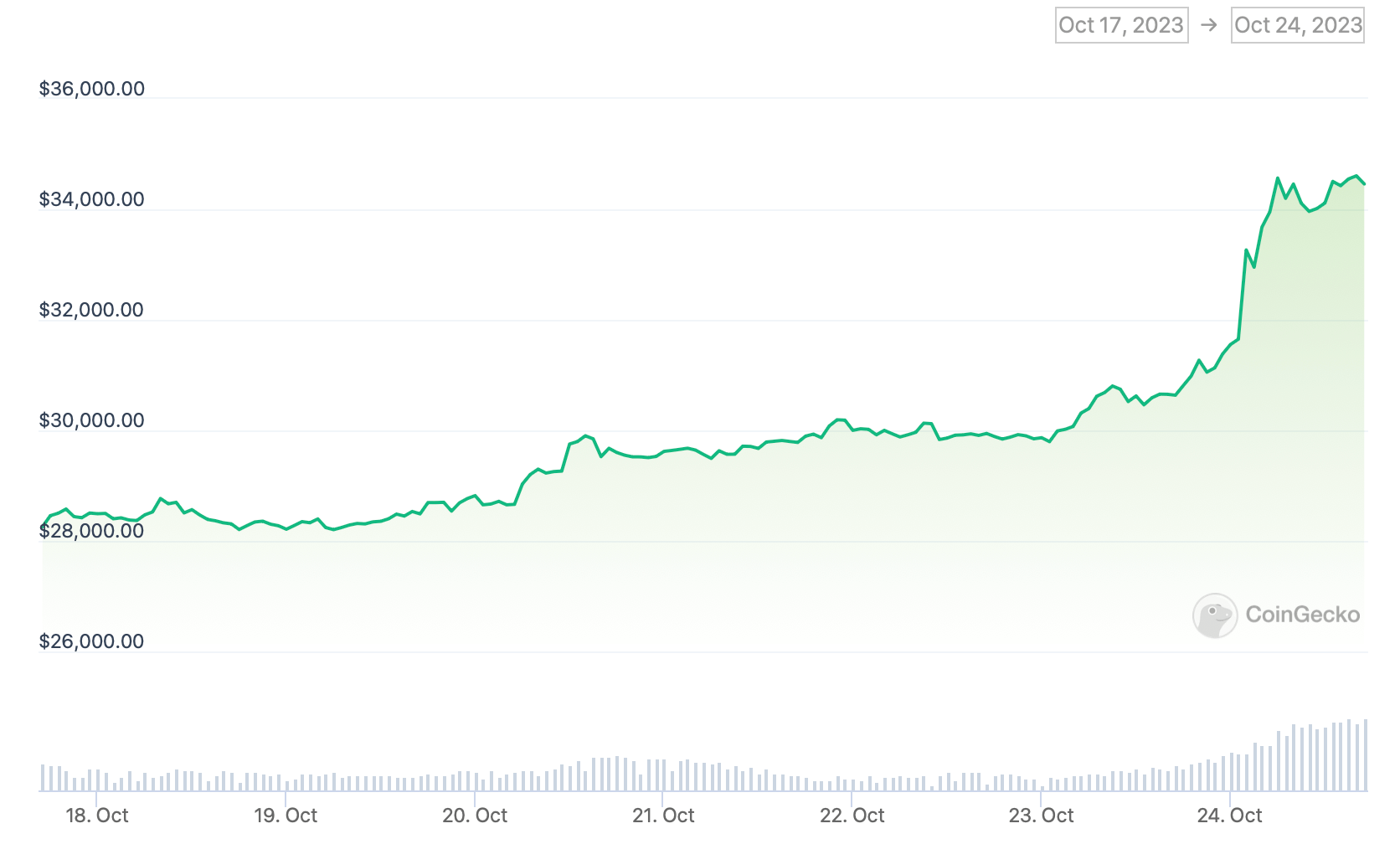 Cena Bitcoina zdołała przekroczyć poziom 35 000 USD. Zmienność głównej kryptowaluty wyraźnie wzrosła na tym tle, a stało się to szczególnie zauważalne po fałszywych wiadomościach o zatwierdzeniu pierwszego spotowego ETF dla BTC w zeszłym tygodniu. Jednak fałszywe wiadomości w żaden sposób nie zmyliły inwestorów. Wręcz przeciwnie – nastąpiła zmiana paradygmatu w zachowaniu tłumu, w wyniku której przyjęcie ETF-ów wraz z przyszłą hossą stało się tylko kwestią czasu.