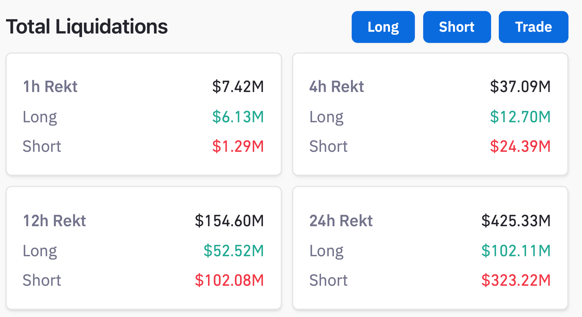 Wolumen likwidacji w handlu z depozytem zabezpieczającym osiągnął poziom 425 milionów dolarów w ciągu ostatnich 24 godzin. Jak widać, 323 miliony z tej kwoty stanowią pozycje krótkie.