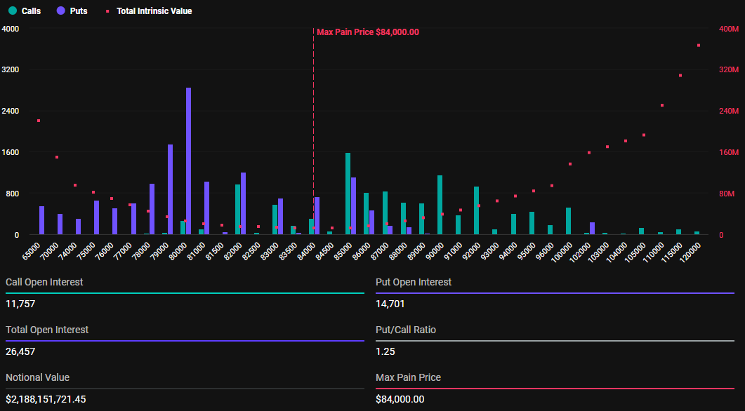 Zgodnie z danymi z Deribit, dziś wygaśnie 26 457 opcji na Bitcoin. To jest znacznie niższe niż w pierwszym kwartale (Q1). Dla przypomnienia, w zeszłym tygodniu wygasło 139 260 kontraktów na BTC. Kontrakty opcyjne, które dziś wygasają, mają stosunek put-to-call 1,25 i maksymalny punkt bólu na poziomie 84 000 USD.