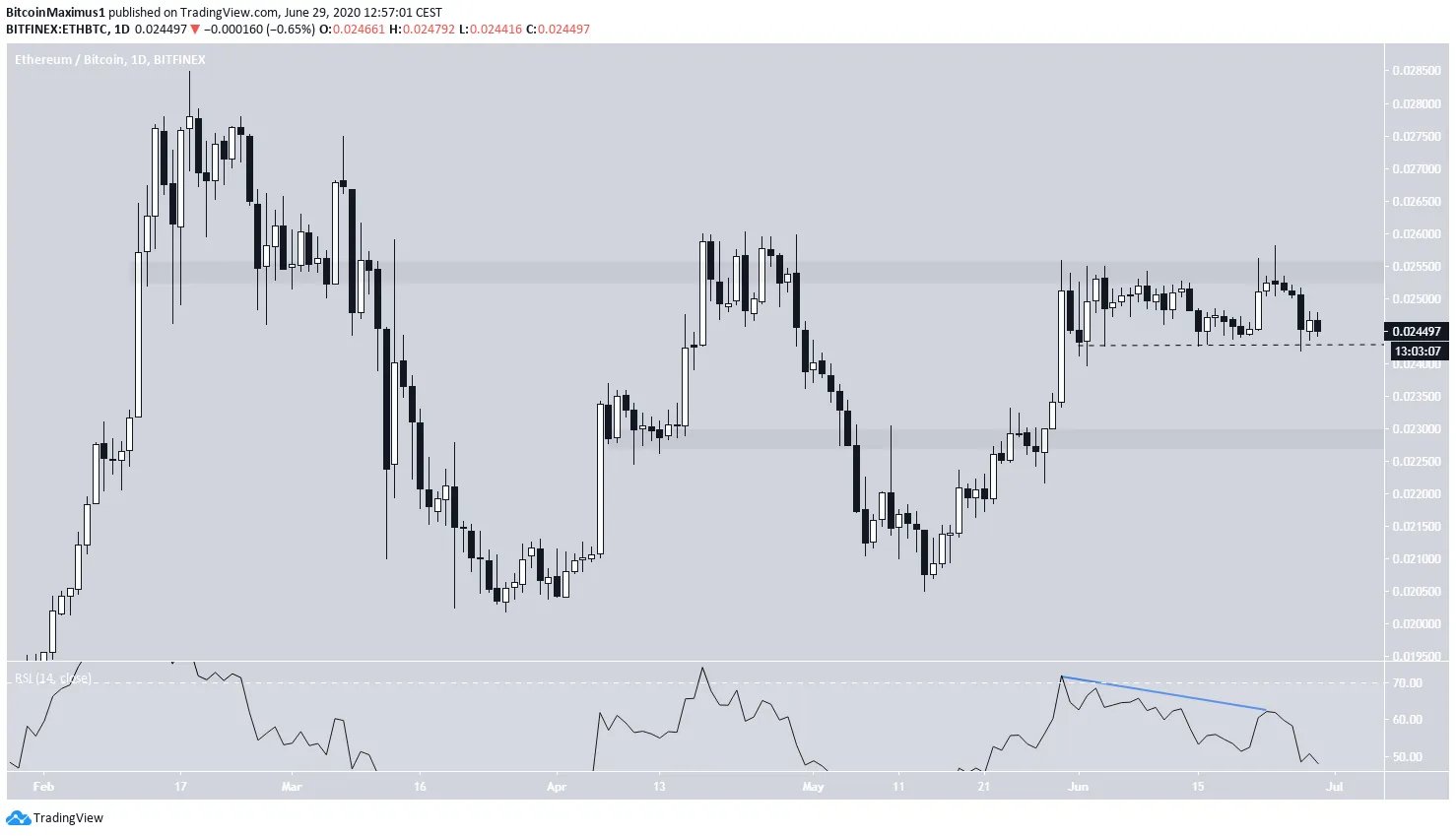 Ruch cenowy Ethereum wygląda niedźwiedzio. Począwszy od dnia 1 czerwca cena utworzyła podwójny szczyt w obszarze oporu 0,0255 BTC. Co więcej, drugi szczyt był połączony z nagrobkiem doji, znakiem niedźwiedziego odwrócenia, a także z niedźwiedzią rozbieżności w RSI.